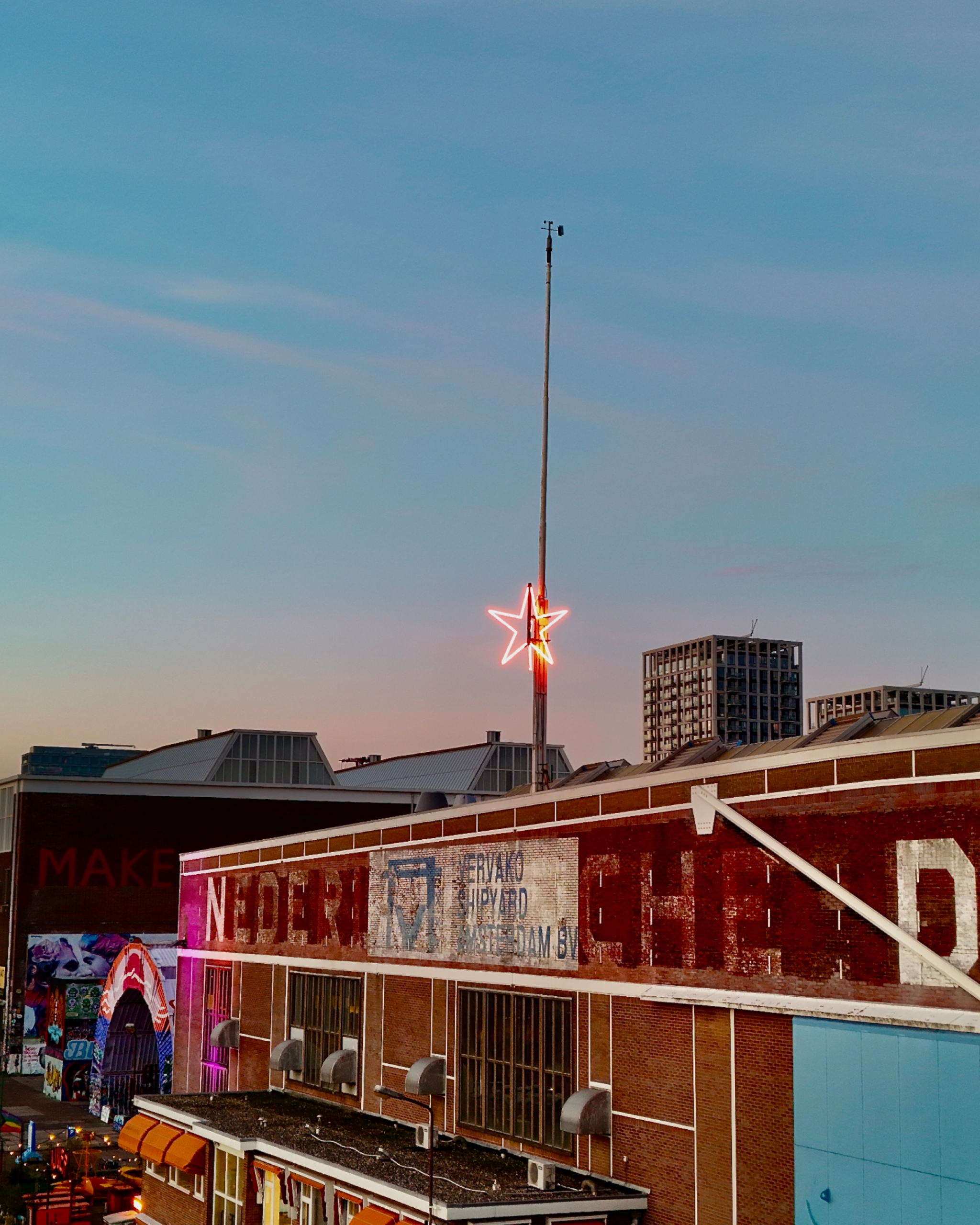 2025 zat bomvol mooie kunst en prikkelende evenementen op NDSM. We kijken nu al uit naar alles wat 2026 gaat brengen. Voor nu: fijne feestdagen en een sprankelend nieuwjaar voor iedereen! Speciaal voor de feestdagen straalt er een verlichte ster op de NDSM Loods. Een feestelijk lichtpunt voor de hele werf, zelfs zichtbaar vanaf iedere pont. Met deze ster hopen we samen een nieuw, jaarlijks terugkerend lichticoon te creƫren voor iedereen op en rond NDSM.